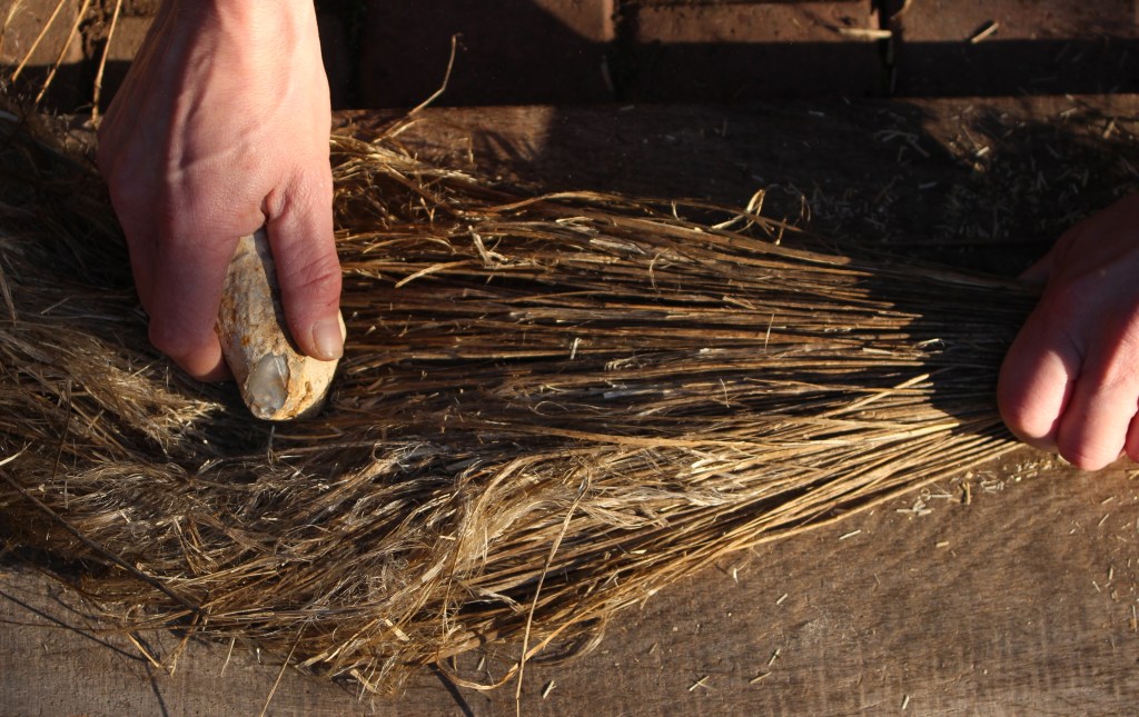Start by grabbing a bunch of flax that you can comfortably hold and grip with one hand. Break the initial stiffness of the stems by bending all along the bunch, then work the tip end first with the stone in your strongest hand. Wrap the root end of the bunch around your other hand a few times to ensure you don’t comb out large bunches of fibre from the middle of the bundle as you work. Scrape toward the tip repeatedly, clearing your working surface of shives as you go.
